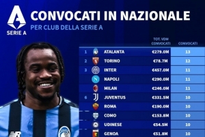 體育資訊11月12日訊 德國轉會市場統計了意甲各隊被國家隊征召球員的數量,并列出榜單,亞特蘭大13人居首,都靈12人次席。