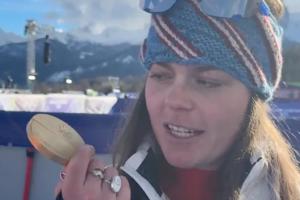 體育資訊02月09日訊 美國(guó)選手布麗茲·約翰遜奪得米蘭冬奧會(huì)高山滑雪女子滑降金牌,賽后布麗茲·約翰遜的金牌和綬帶的連接處損壞。