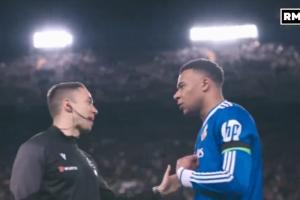 DAZN攝像機(jī)拍到姆巴佩上半場結(jié)束后與第四官員溝通。