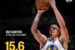 體育資訊2月9日訊 勇士官推今天曬圖分享了一組桑托斯近5場比賽打出的數據:場均15.6分,運動戰命中率68.2%。