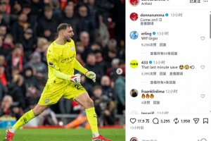 曼城門將多納魯馬補時階段做出關鍵撲救,幫助球隊取勝,賽后他在社交媒體上曬出慶祝勝利的照片,配文:“太棒了!”