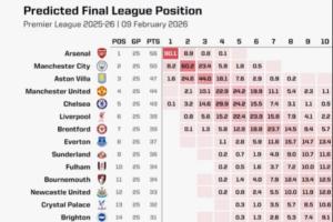 體育資訊02月09日訊 英超第25輪結束,阿森納6分領跑積分榜,曼城、維拉分列二三。opta也更新了英超奪冠概率,其中阿森納高達90.1%,曼城8.2%,維拉1.6%,切爾西0.1%,利物浦和曼聯則是0%。