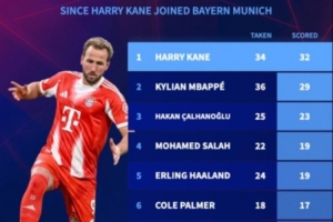 德轉列凱恩加盟拜仁后五大聯賽球員各項賽事同期點球榜: