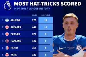 體育資訊2月10日訊 切爾西在本輪英超3-1擊敗狼隊,帕爾默上演帽子戲法,《轉會市場》統計顯示帕爾默已經在英超4次戴帽,位列聯賽歷史第16位。