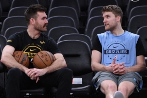 勇士主場迎戰灰熊,賽前斯潘塞兄弟合影留念。