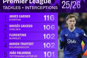 體育資訊2月10日訊 squawka統計了本賽季英超球員的搶斷+攔截情況,詹姆斯·加納力壓凱塞多居首。