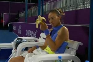 比賽期間,鄭欽文在場邊補給時,發現香蕉上有螞蟻,她彈掉螞蟻后端詳再三,接著把香蕉吃了。
