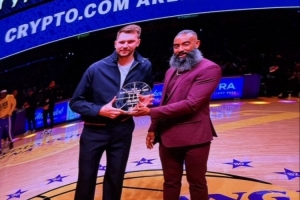 湖人主場迎戰馬刺,賽前東契奇領取了1月的月最佳球員獎杯。