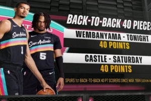 上一場戰勝獨行俠,卡斯爾砍下40分12籃板12助攻。這是馬刺自1984年的格文和邁克·米切爾以來,首次出現連場不同球員砍下40+的情況。