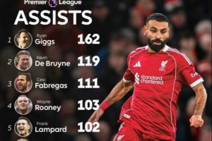 體育資訊2月12日訊 在本輪英超利物浦對桑德蘭比賽中,薩拉赫送出助攻,他的助攻數(shù)也升至英超歷史并列第7,具體榜單如下: