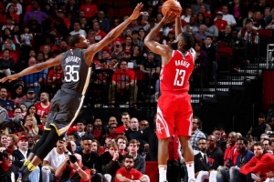 下一年,庫(kù)里73勝賽季,撤步三分59中37,哈登45中18。