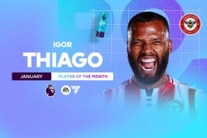 1月份伊戈爾·蒂亞戈出戰5場比賽打進5球,幫助布倫特福德取得2勝1平2負的戰績,他也擊敗了恩佐、多爾古、維爾茨等候選,繼去年11月后第二次當選英超月最佳球員。