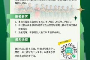 體育資訊02月13日訊 浙江FC宣布對2007-2016年齡段梯隊進行補強選拔,并公開了報名流程。