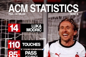 體育資訊2月14日訊 意甲第25輪比賽,莫德里奇破門,米蘭客場2-1擊敗比薩,米蘭官方社媒曬出莫德里奇本場比賽的數據,配文:“大師風范。”