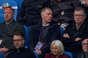 體育資訊02月14日訊 曼城vs索爾福德城第18分鐘,鏡頭給到看臺,索爾福德城股東斯科爾斯在現場觀戰。