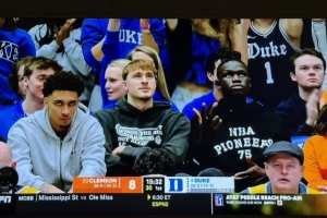 因腳部中足扭傷而缺席了全明星新秀賽的弗拉格回到杜克大學觀戰(zhàn)。