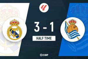上半場補時4分鐘。半場戰罷,皇馬3-1皇社。