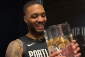 賽后,利拉德在后臺和字母哥分享自己的獎杯,字母哥說道:“只有其他兩名球員贏得過三次三分大賽冠軍。”
