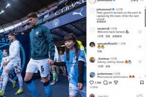 斯通斯社媒曬出比賽照片,慶祝復出,配文:“重返賽場并擔任隊長感覺真好,晉級下一輪!”
