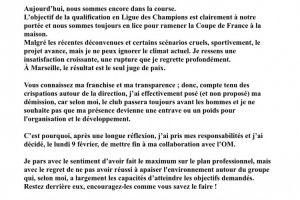 因此,經過深思熟慮,我承擔起責任,于2月9日星期一決定終止與馬賽俱樂部的合作。我離開時感到自己在職業層面已竭盡全力,很遺憾未能平息球隊周圍的環境,但我認為這支隊伍完全有能力實現既定目標。請繼續支持他們,用你們一貫的方式為他們加油!