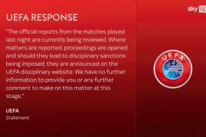 歐足聯(lián):“昨晚比賽的相關(guān)官方報(bào)告目前正在審查中。若有相關(guān)事件被上報(bào),將啟動(dòng)相應(yīng)程序;如最終作出紀(jì)律處罰,相關(guān)結(jié)果會在歐足聯(lián)紀(jì)律官網(wǎng)公布。現(xiàn)階段,我們無法向你提供更多信息,亦不會就此事項(xiàng)發(fā)表進(jìn)一步評論。”