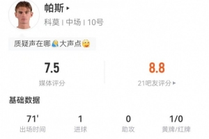 體育資訊2月19日訊 科莫在本輪意甲1-1暫時戰平米蘭,帕斯本場數據如下: