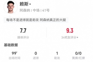 體育資訊2月19日訊 阿森納在本輪英超對陣狼隊,賴斯本場數據如下: