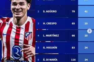 體育資訊2月19日訊 在歐冠附加賽馬競3-3戰平布魯日的比賽中,阿爾瓦雷斯破門。以下為阿根廷球員在歐冠歷史進球榜: