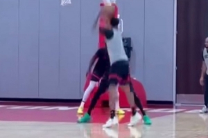 體育資訊2月19日訊 美媒露天看臺曬出了火箭全明星后首次訓練畫面,寫道:“杜蘭特成功防下小賈巴里。”