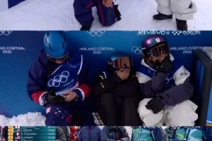 “頭條新聞”微博報道了比賽中有趣的一幕,據悉在該項目最后一個選手上場前,領獎臺候選人前三名因緊張而蹲在一起“抱團取暖”,畫面非常有趣引人關注。
