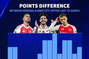 體育資訊2月19日訊 英超第31輪比賽,阿森納客場2-2戰平狼隊。德國轉會市場列出表格,盤點了近15場英超比賽阿森納與曼城的積分差距,阿森納最多領先7分,而目前多賽1場領先5分。