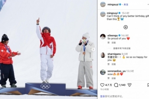 賽后蘇翊鳴更新ins,曬出自己在領(lǐng)獎臺單手指天的照片,并配文寫道:“無法想象還有比這個(gè)更棒的生日禮物!”