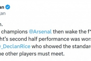 摩根寫道:“表現不夠好。若想成為冠軍,阿森納就他X趕緊醒醒吧,別等到為時已晚。昨晚下半場的表現是我多年來見過的最糟糕的。唯獨賴斯值得寬容——他展現的拼勁和強度正是其他球員必須達到的標準。”