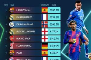 體育資訊02月19日訊 Football Benchmark今日更新了球員身價,在其最新的身價排行中,亞馬爾以2.868億歐位居榜首,姆巴佩和哈蘭德也突破2億歐。
