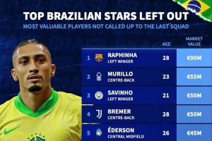 未入選本期巴西隊名單球員身價榜(包括因傷缺席):