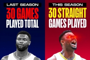 體育資訊2月20日訊 據(jù)統(tǒng)計(jì),錫安賽季至今共計(jì)出場40場比賽,且已經(jīng)連續(xù)出場了30場比賽。