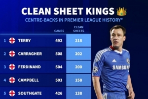 體育資訊2月20日訊 德國轉會市場統計了英超歷史中衛零封的場次,并列出榜單,特里218場居首,卡拉格、費迪南德二三位。