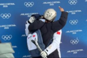 場邊央視鏡頭記錄到,在王心迪完成完美一跳后,徐夢桃跑過來送給愛人一個大大的擁抱!