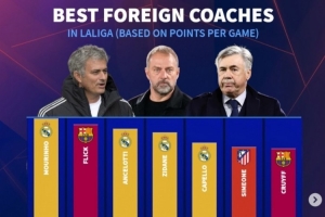 體育資訊2月21日訊 《轉(zhuǎn)會市場》統(tǒng)計了西甲歷史至少執(zhí)教50場的外籍主帥場均拿分情況,穆帥依然領(lǐng)跑。