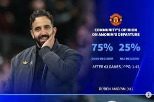 阿莫林(曼聯):63場,場均1.43分。75%支持,25%反對。