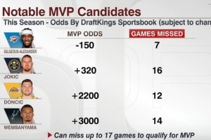 本賽季目前MVP賠率前4(最多缺席17場):