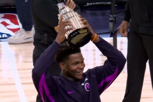 體育資訊2月21日訊 森林狼主場迎戰獨行俠,賽前,愛德華茲在主場向球迷們展示全明星MVP獎杯,接受球迷們的歡呼。
