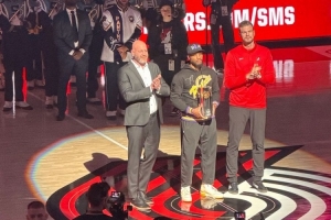 利拉德帶著第三座三分大賽獎杯回到波特蘭,并在主場球迷歡呼中舉起了獎杯。