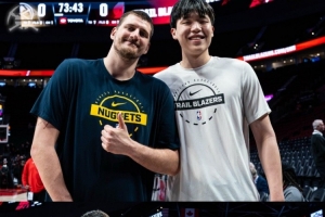 賽前,楊瀚森和約基奇進行交流還合影;掘金官方發圖道:“我們期待已久的會面終于到來??。”