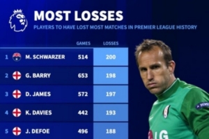 體育資訊2月21日訊 德國(guó)轉(zhuǎn)會(huì)市場(chǎng)統(tǒng)計(jì)了球員在英超的輸球場(chǎng)次,并列出英超歷史輸球場(chǎng)次榜,施瓦澤200負(fù)最多,巴里198負(fù)第二。