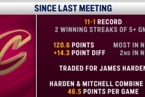 騎士近12場(chǎng)11勝1負(fù),場(chǎng)均得到120.6分,凈勝14.3分;哈登&米切爾搭檔后,兩人場(chǎng)均砍下46.5分。
