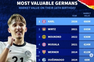 體育資訊2月22日訊 拜仁小將卡爾今日迎來(lái)18歲生日,數(shù)據(jù)統(tǒng)計(jì)顯示他也是歷史同齡德轉(zhuǎn)身價(jià)最貴的德國(guó)球員。