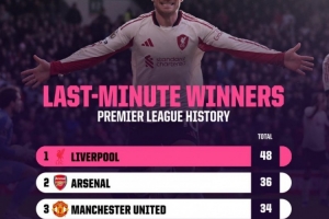 以下為英超歷史球隊在90分鐘后打進絕殺次數(shù)榜,具體如下: