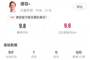本場(chǎng)比賽荷蘭中場(chǎng)弗蘭基?德容為巴薩首發(fā)踢滿全場(chǎng),全場(chǎng)比賽他不僅完成破門,還成為球隊(duì)的節(jié)拍器,傳球多達(dá)116腳的同時(shí),傳球成功率高達(dá)97%。最終他獲得了9.8分的全場(chǎng)最高評(píng)分。