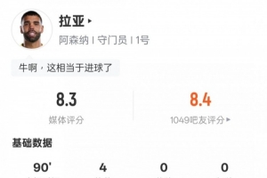 體育資訊2月23日訊 英超第27輪焦點戰,阿森納4-1戰勝熱刺。拉亞首發出戰,表現出色,貢獻全場最多的4次撲救,評分8.3。